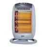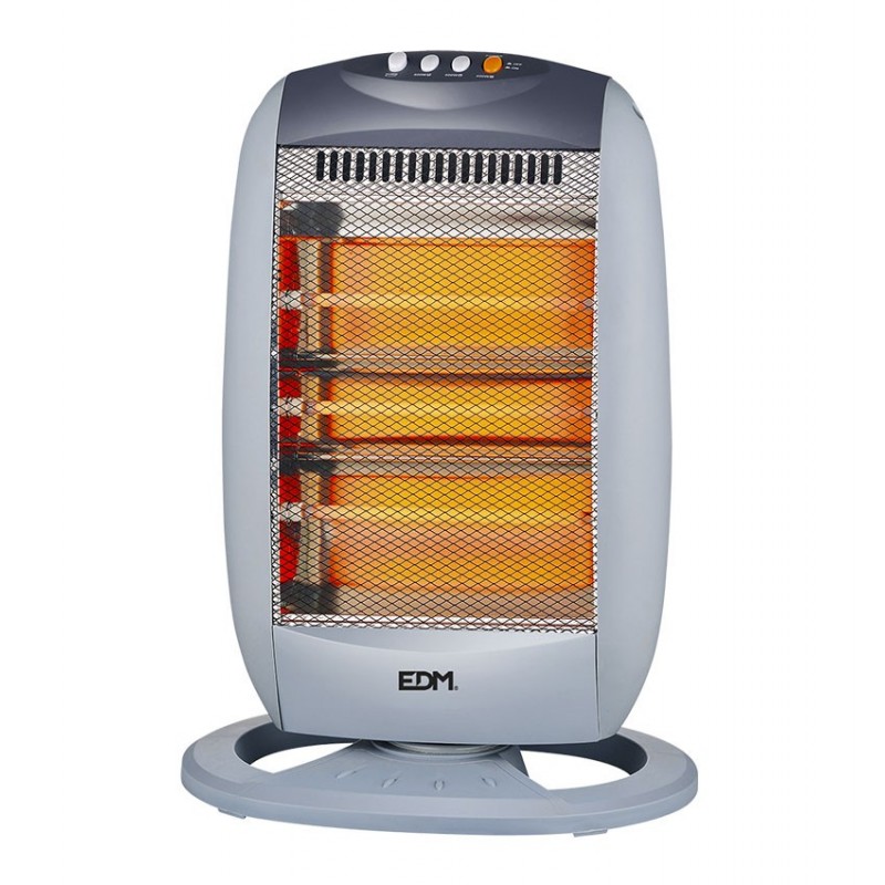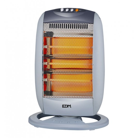 Estufa halógena oscilante con 3 barras de cuarzo, 3 niveles diferentes de potencia (400-800-1200W) que producen una emisión instantánea de calor. Con indicador luminoso de encendido y asa de transporte. Además, incluye una base antideslizante para evitar posibles accidentes. Con protección contra el sobrecalentamiento. 220/240 V- 50Hz.