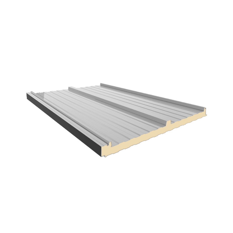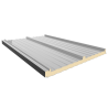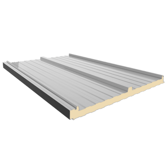 Panel para cubiertas inclinadas con una pendiente mínima del 7%. Sistema de tornillería con fijación oculta, compuesto de una plaqueta de acero de espesor 2 mm con tornillo de alta calidad que garantiza elanclaje de los paneles contra la correa. La solución se completa con un perfil de acero (tapajuntas) disponible en los mismos colores y acabados de los paneles. El diseño de esta pieza garantiza el aislamiento y la absoluta estanqueidad de la cubierta del edificio.