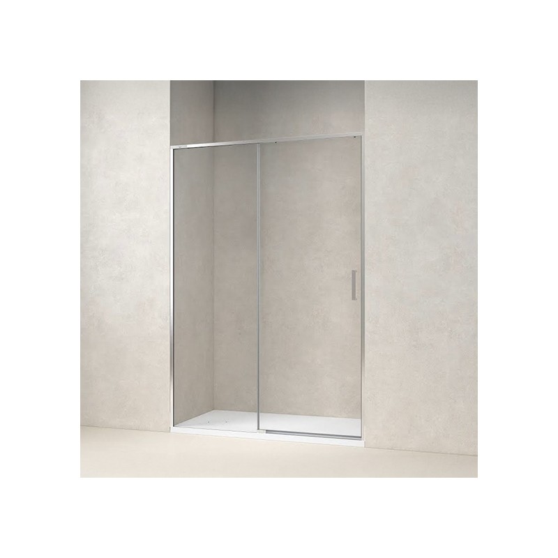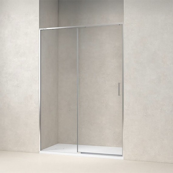 L2-E - Frontal ducha de 1 hoja corredera + 1 fija. Para instalar entre paredes o con un lateral fijo LF-C. Cristal transparente y perfil plata brillo o negro mate.